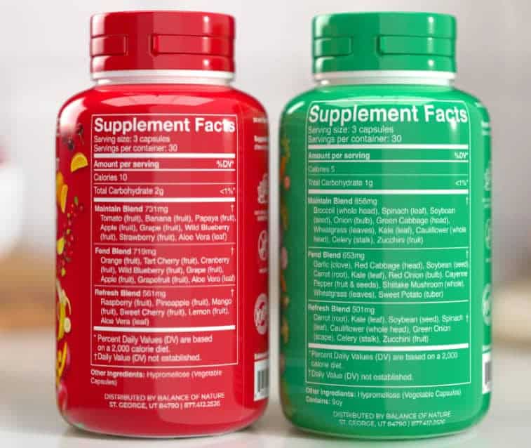 Balance of Nature comes in a set of two: a fruit formula and a vegetable formula. Both fruit and vegetable supplements contain three blends, including the maintain blend, fend blend, and refresh blend.