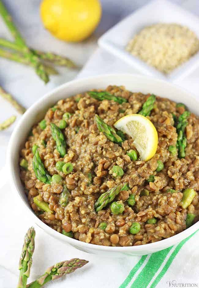 This Lentil Quinoa with Asparagus and Peas is a gluten-free and tasty whole-foods dish using spring produce. It's a one-pot meal so there's not much clean up - it's a win-win!