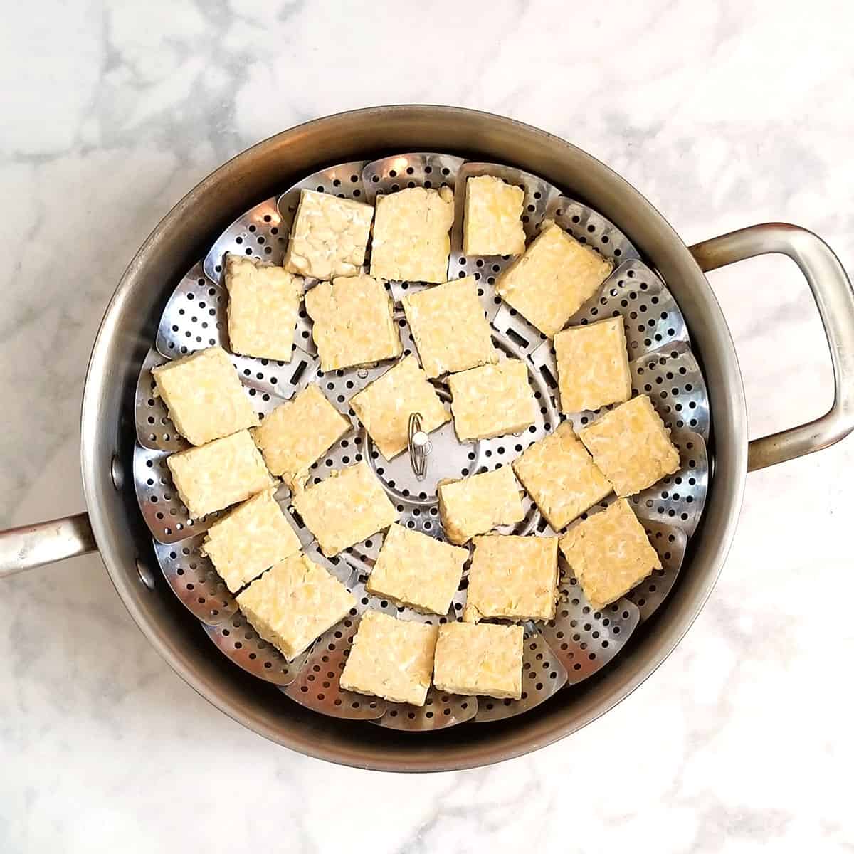 First up, I highly recommend giving your tempeh a steam before doing anything else. While this step is technically optional (and might not be needed in some recipes), I promise that it will improve the flavor by removing some bitterness.